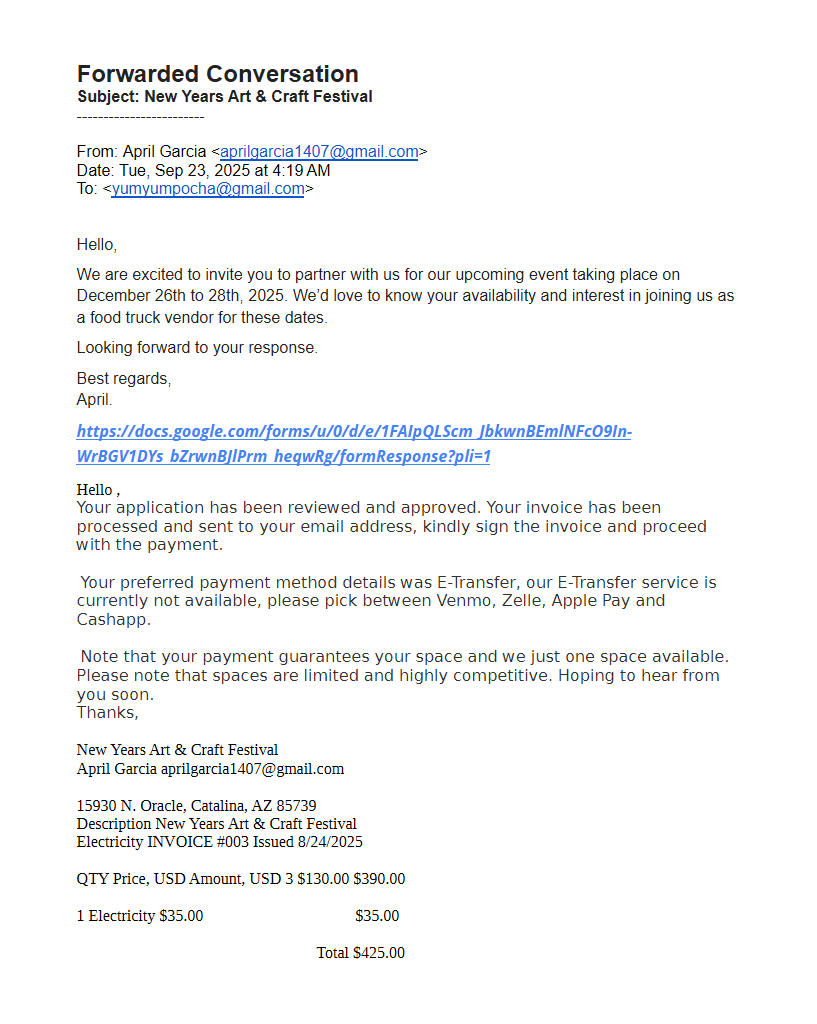 Hello Artists: Thanks for visiting our website. Scammers are at it again. They go to Festival.net, pull our market dates and our flyer, and invite food trucks to come to the event.